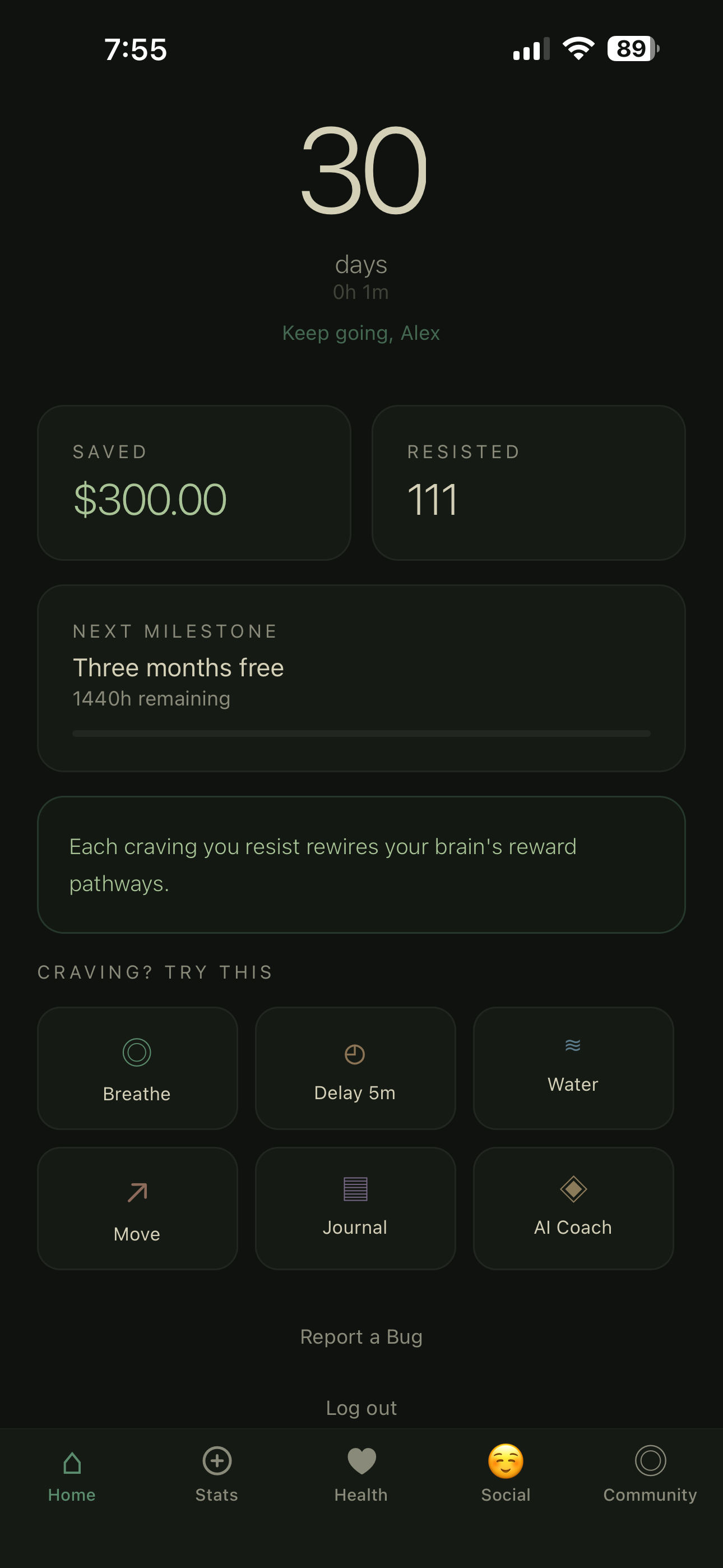 Talk to your AI quit coach anytime. It knows your triggers, your patterns, and your progress — and gives advice that actually fits.